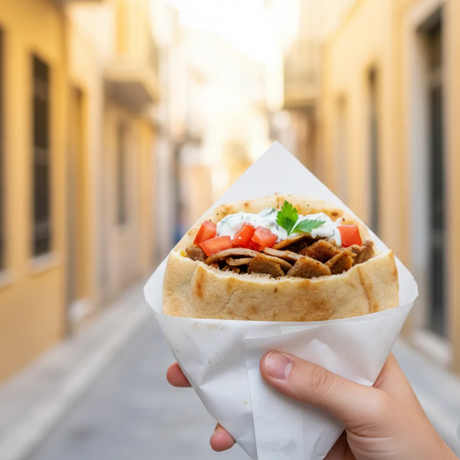 Souvlaki pita Pain chaud, viande grillée, tomates juteuses, oignons doux et herbes fraîches. Le classique absolu : rapide, généreux, réconfortant. Les meilleures adresses sont souvent les plus discrètes, celles qui servent en continu.