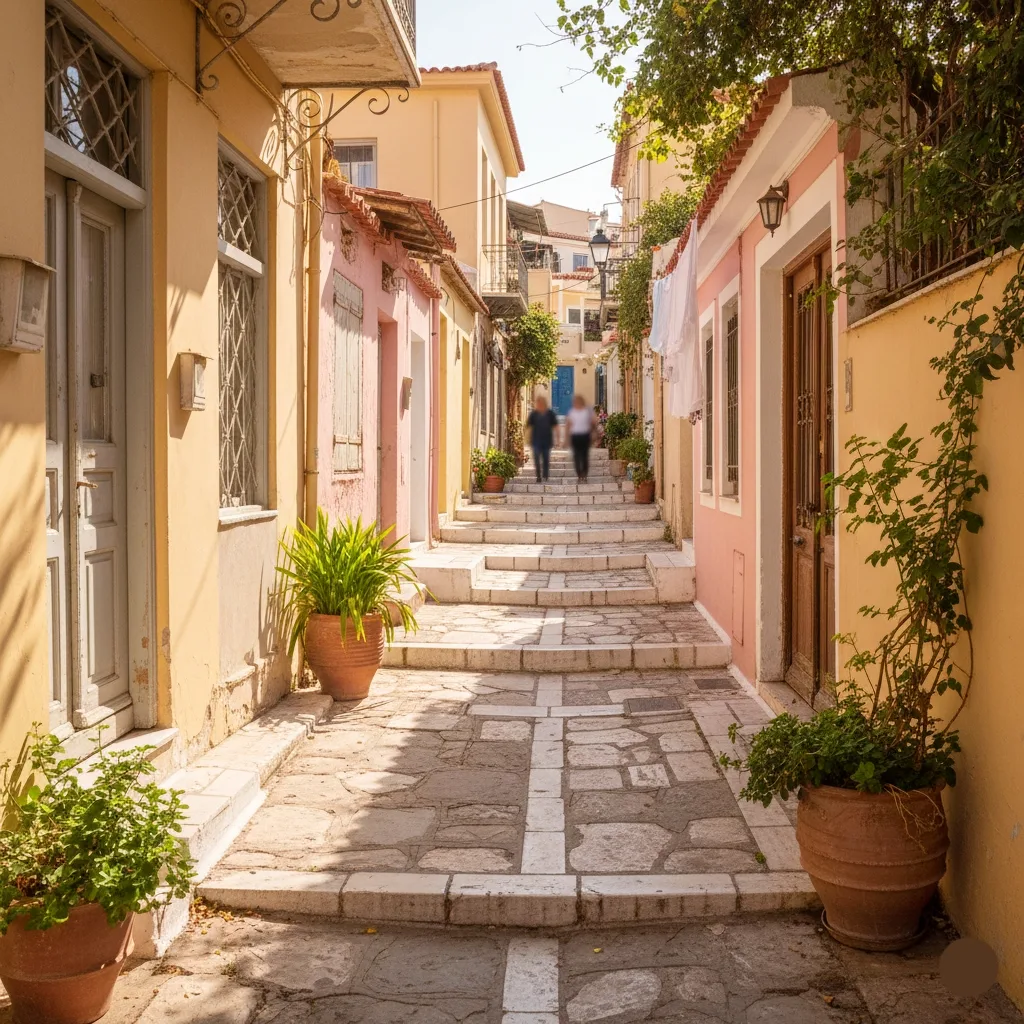 Ruelles pavées, murs pastel, ombres de bougainvilliers : Pláka dévoile un rythme calme, presque insulaire, où l’on avance en douceur. Un entrelacs ancien qui permet de sentir la ville battre derrière chaque façade.