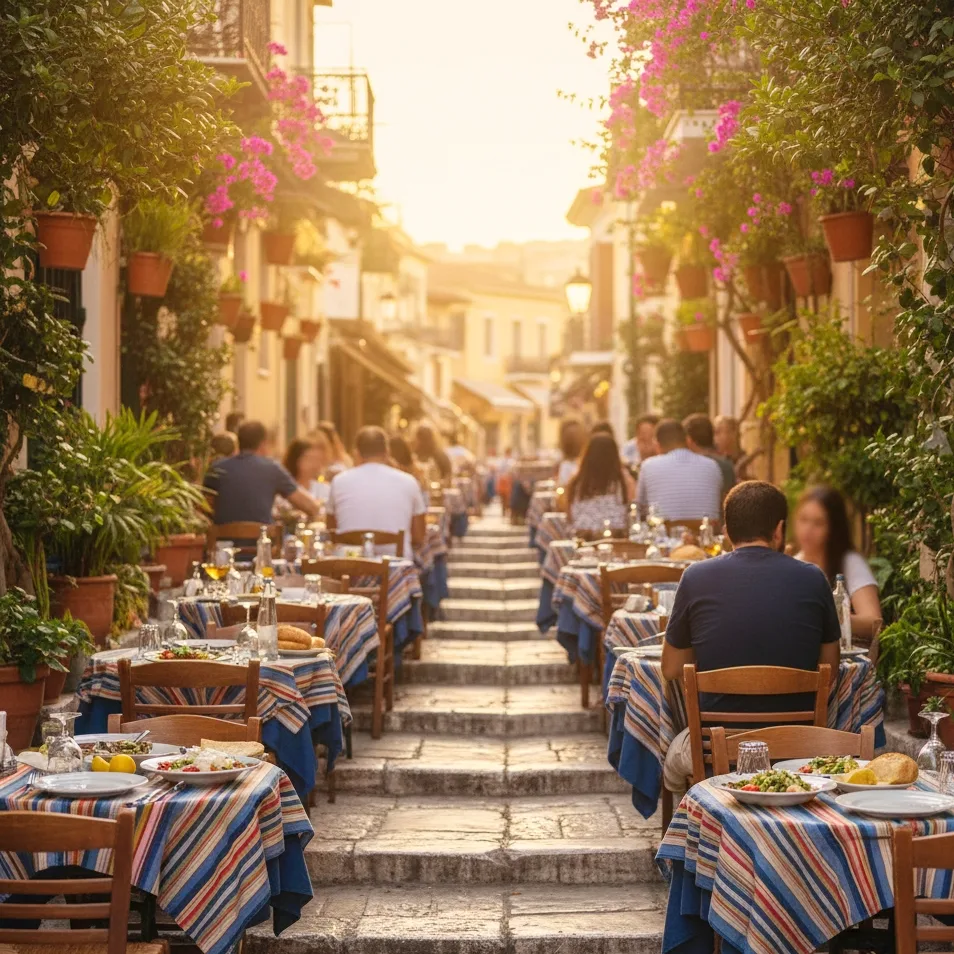 Déjeuner… sur un escalier Les terrasses en gradins de la Rue Mnisikleous offrent un repas simple et local : mezzés, salades, citron frais et ombre légère sous les pergolas. Une pause gourmande où l’on savoure l’âme du quartier autant que son assiette.