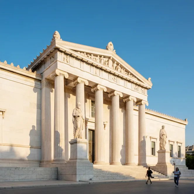 Bibliothèque, Université, Académie : trois bâtiments qui composent un ensemble harmonieux, symbole du renouveau culturel du XIXe. Colonnes monumentales, façades claires, statues de philosophes : une promenade où l’histoire rencontre l’éducation.
