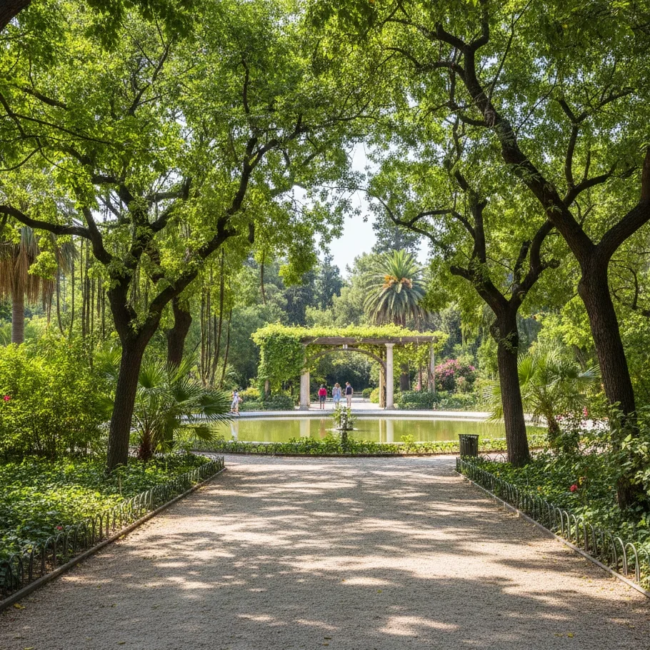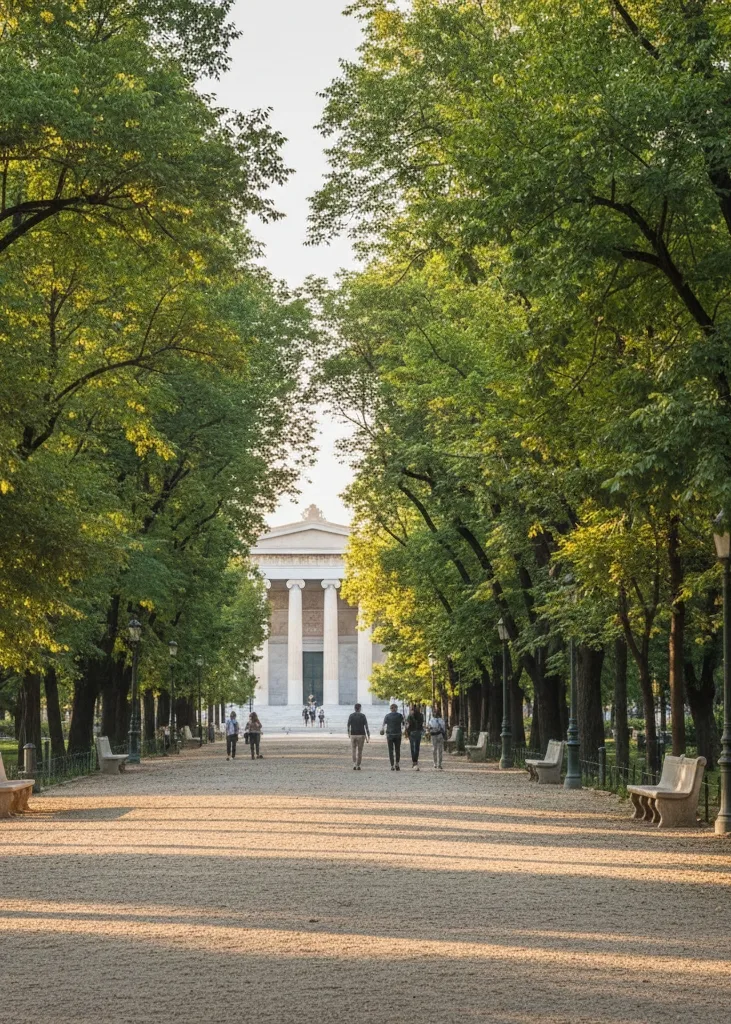 Allées ombragées, pelouses entretenues, bâtiments néoclassiques. Un refuge central où l’on respire, lit et retrouve un peu de fraîcheur entre deux visites.