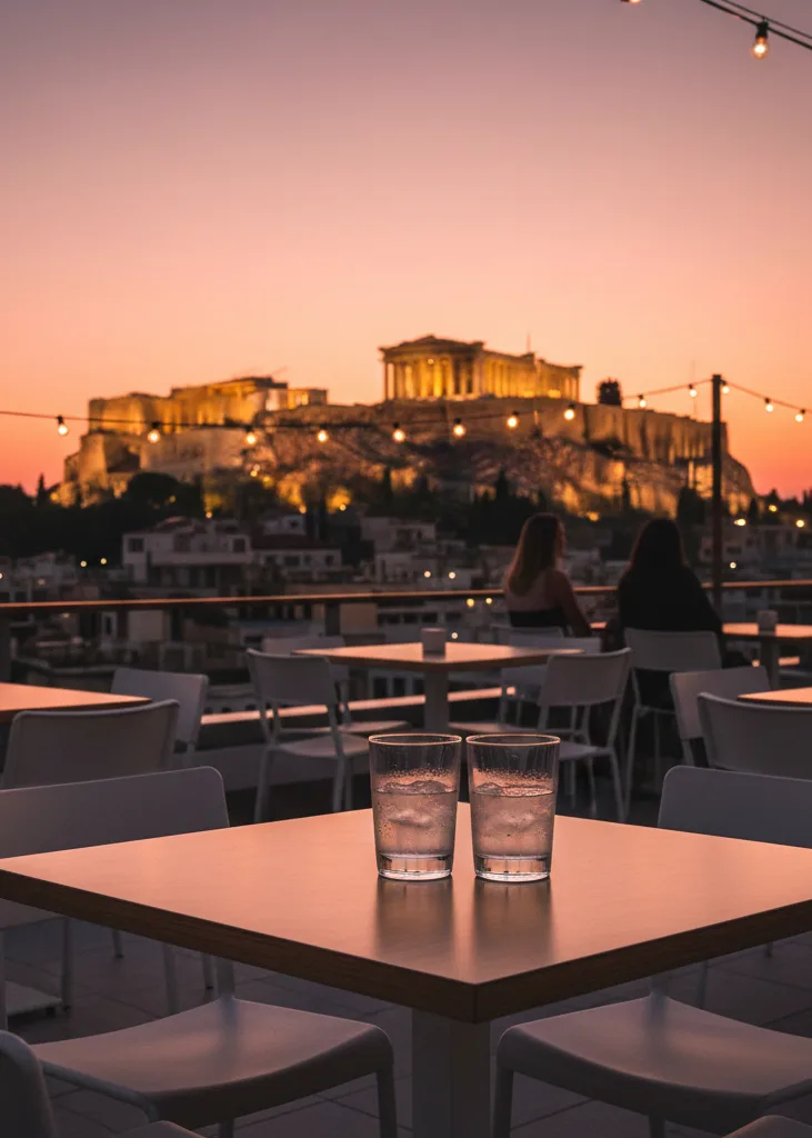 Sur les hauteurs de Thissio, certains rooftops ont vue sur l’Acropole au crépuscule : lumière dorée, atmosphère locale, horizon dégagé. Idéal pour l’ambiance et la photo.