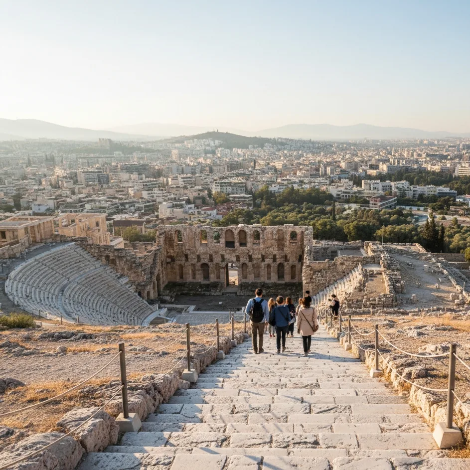 Montez par la pente sud : c’est l’accès le plus harmonieux et le plus narratif. On suit les vestiges du Théâtre de Dionysos, on longe l’Odéon d’Hérode Atticus, et l’on gagne le sommet par une progression naturelle qui dévoile l’histoire pas à pas. Cette montée progressive offre un aperçu vivant de la cité antique, avant même d’arriver au plateau monumental.
