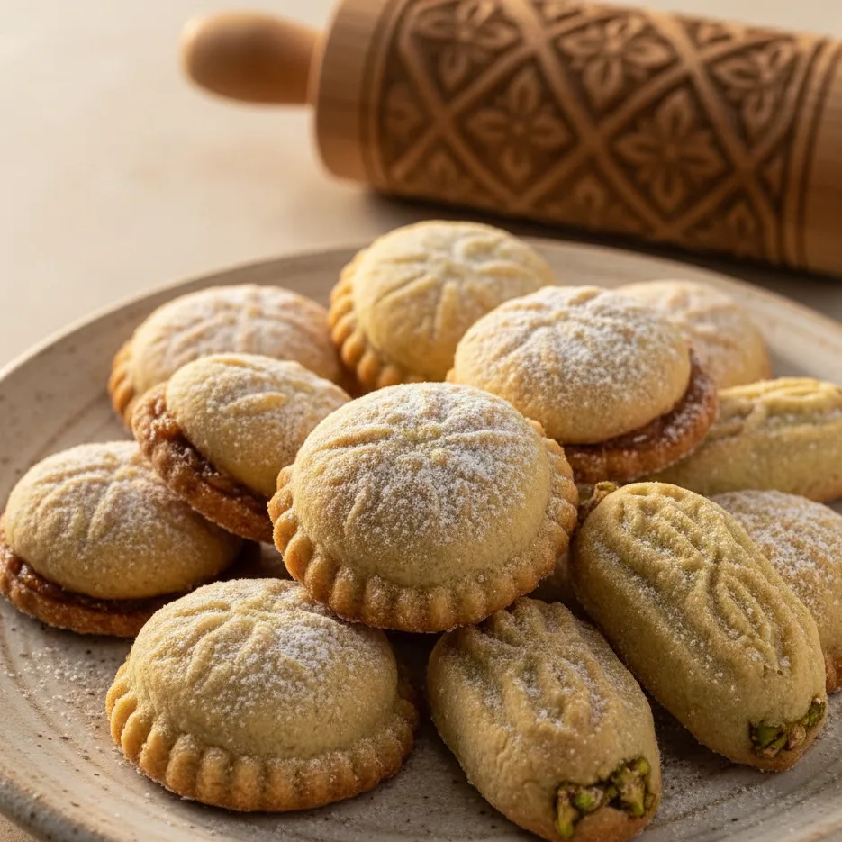 Biscuits sablés moulés à la main, garnis de dattes ou de pistaches, souvent préparés en famille avant les grandes fêtes. Le genre de plaisirs qu’on apporte sur un plateau… et qui disparaît plus vite que l’éclair.