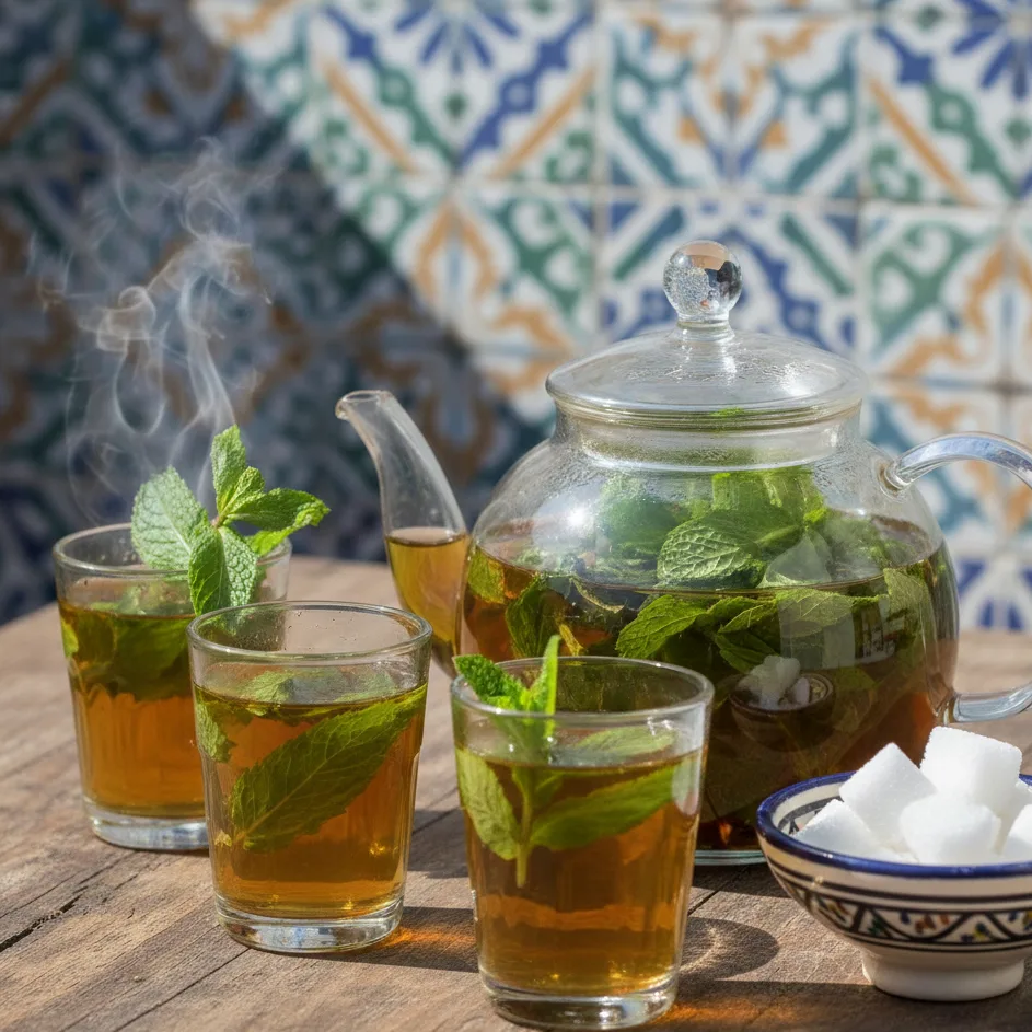 Verres brûlants, feuilles de menthe fraîche, sucre dosé au goût : le thé accompagne les fins de repas prolongées, quand plus personne n’a faim, mais que personne n’a vraiment envie de partir.