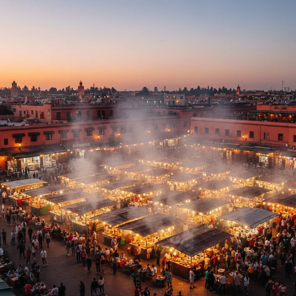 Fumées de grillades, appels des marchands, parfums d’orange et d’épices : la place Jemaa el-Fna résume l’énergie du pays. Au coucher du soleil, elle devient un théâtre vivant où la cuisine accompagne chaque pas.