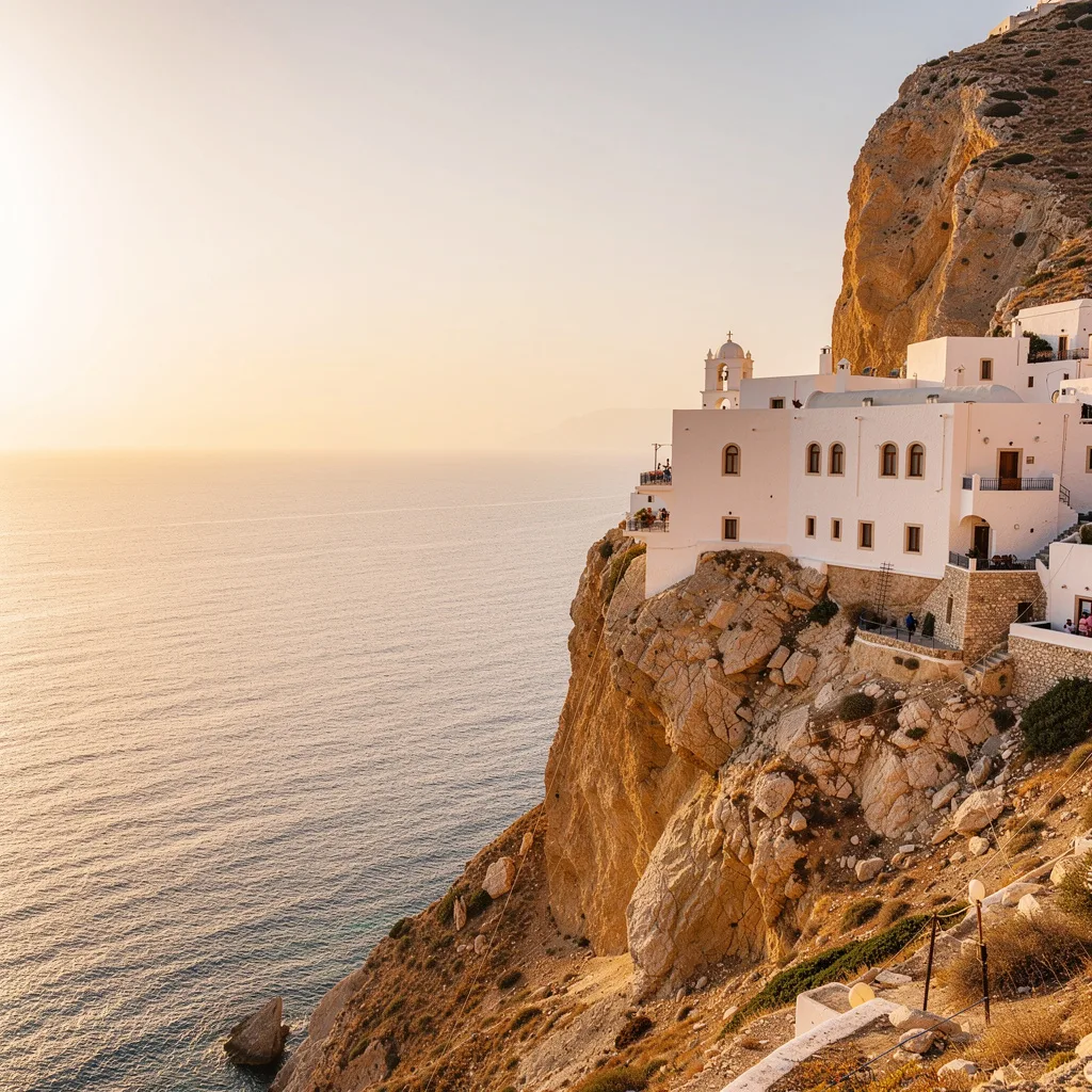 Accroché à la falaise comme une prière, le monastère de Panagia Hozoviotissa se dévoile après une montée blanche de lumière. On l’aperçoit d’abord minuscule, puis il grandit, plaque de chaux posée sur le roc. À l’intérieur, le temps se rétracte : icônes assombries, odeur d’encens, voix basse des moines. Par la fenêtre, la mer Égée découpe une ligne d’un bleu presque irréel.