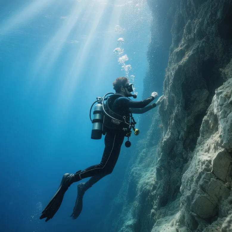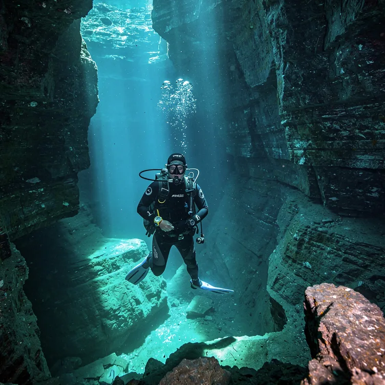La plongée verticale. Ici, la roche tombe net et la lumière suit. Un spot puissant, direct, pour ressentir la profondeur sans détour.