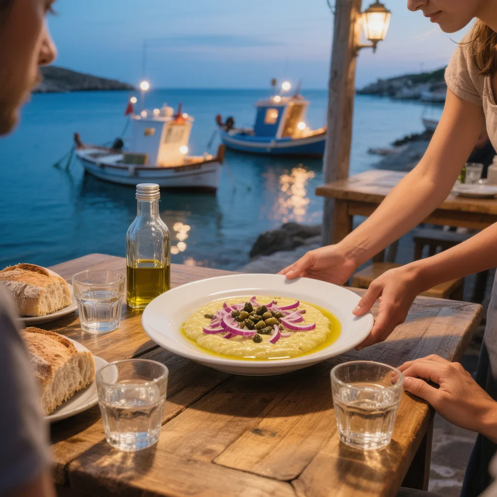 Purée de pois cassés servie tiède, nappée d’huile d’olive, relevée d’oignons rouges et parfois de câpres séchées. Sa texture douce et dense, qui comble plus d’un palais, résume
