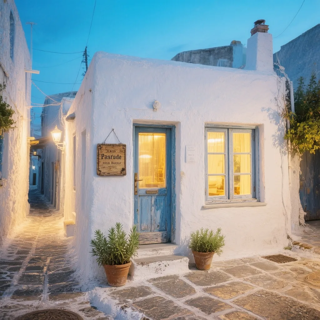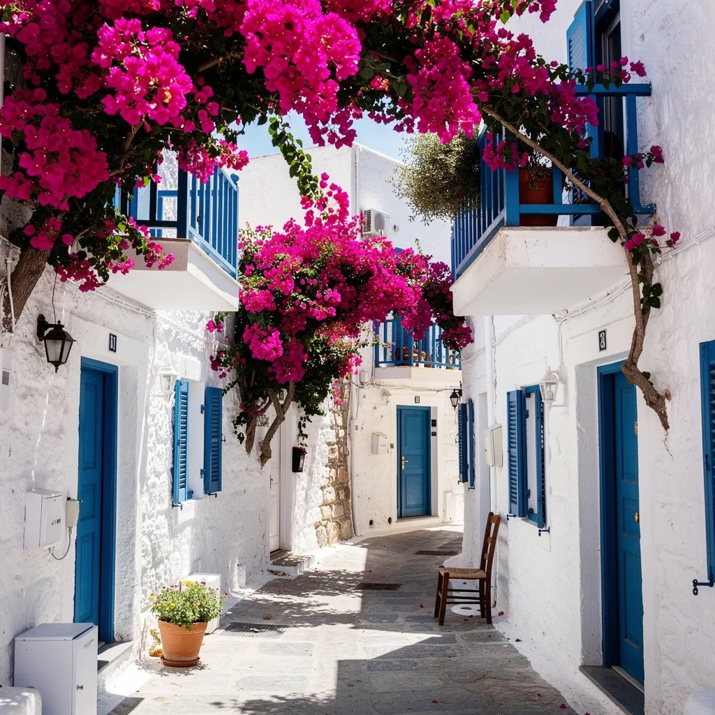 Au milieu de l’île, Chora semble posée comme un secret bien gardé. Les maisons blanchies se serrent autour d’un dédale de venelles où filent les chats somnolents, et où des bougainvilliers pointent leur fuchsia dans les angles de lumière. Rien n’est spectaculaire, tout est harmonieux : un banc, une porte bleue, une corde à linge qui parle d’une vie douce. Au fil des heures, le village change de visage : bleuté au matin, éclatant à midi, doré le soir. On y apprend à ralentir.