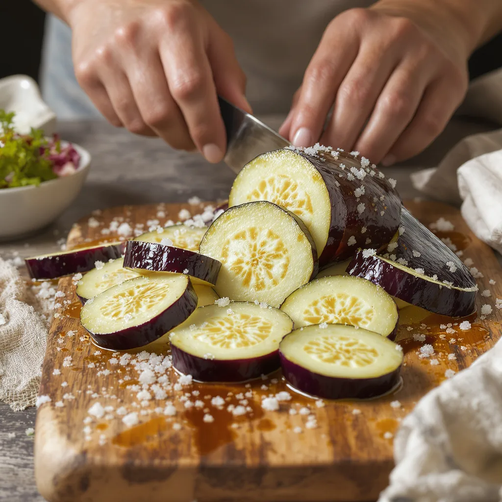 Travailler les tranchesTrancher, saler, laisser reposer, puis cuire doucement. L’objectif n’est pas de frire, mais d’obtenir des tranches souples, prêtes à accueillir la sauce sans se casser.