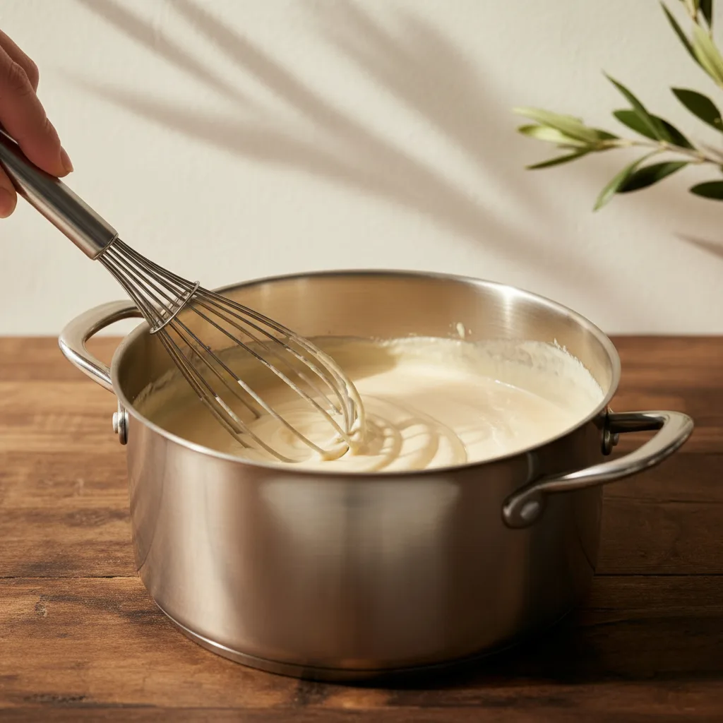 La couche blancheBéchamel plutôt épaisse, parfois enrichie d’œufs ou de fromage. Elle n’est pas là pour masquer, mais pour lier, et permettre à la moussaka de se tenir à la coupe.