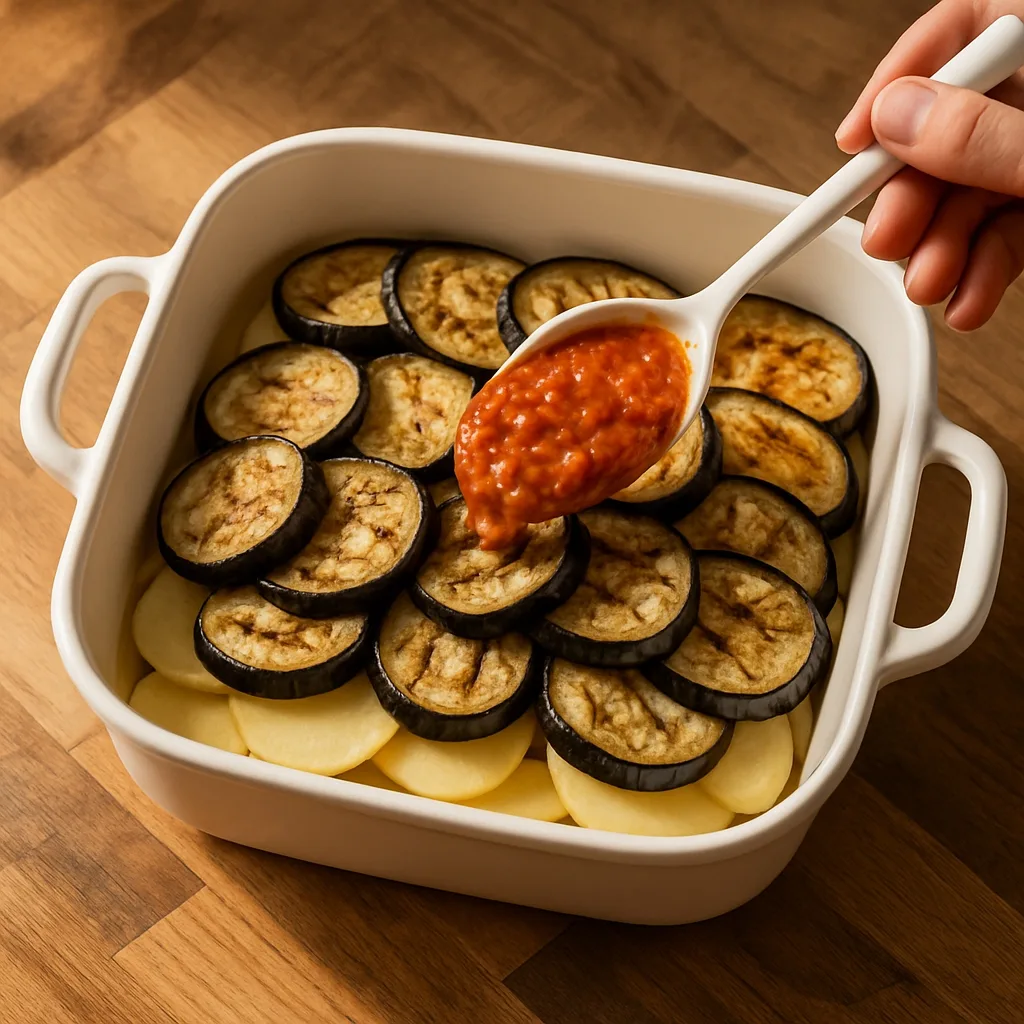 Monter par couchesPommes de terre, aubergines, sauce, puis béchamel : chaque strate doit rester visible une fois servie. C’est ce dessin en coupe qui signe une moussaka soignée.