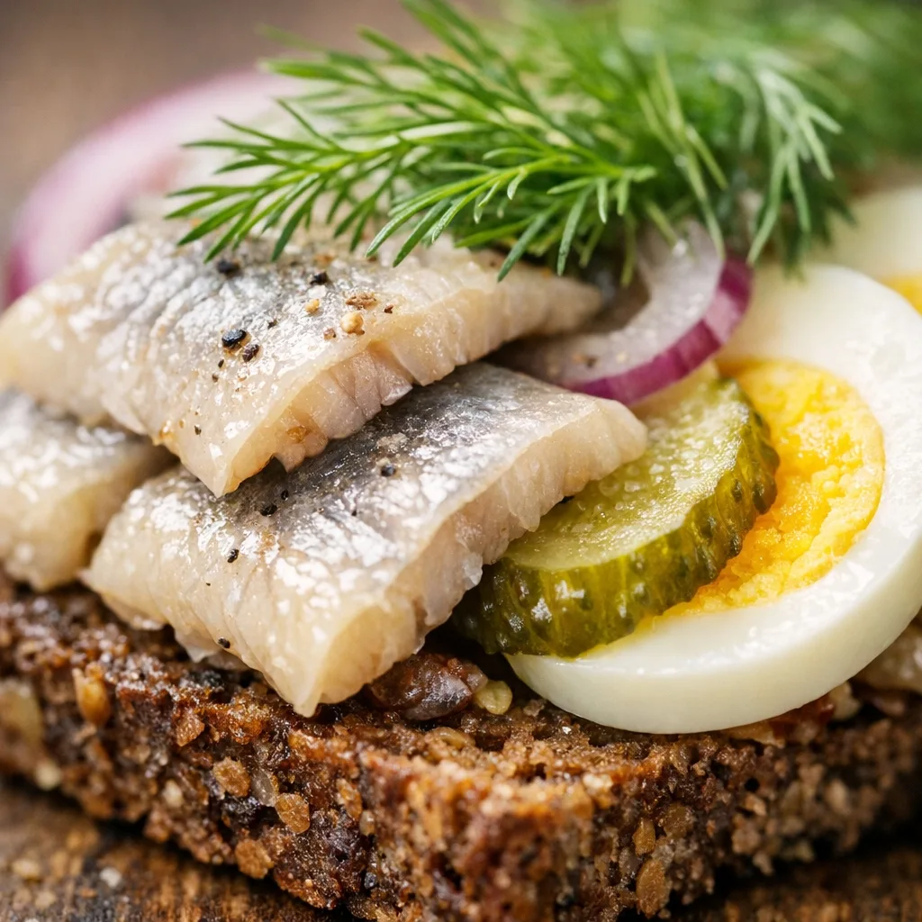 Le Smørrebrød Tartine emblématique servie sur pain de seigle dense. Garnitures possibles : hareng, crevettes, saumon, roastbeef ou œuf avec pickles et aneth. C’est le plat rapide et typiquement danois par excellence, facile à trouver dans les halles, les cafés ou les cantines, idéal pour le déjeuner.