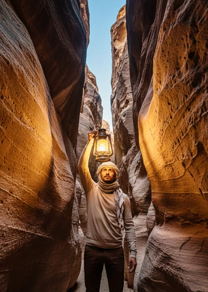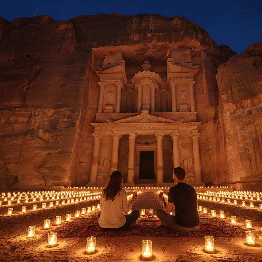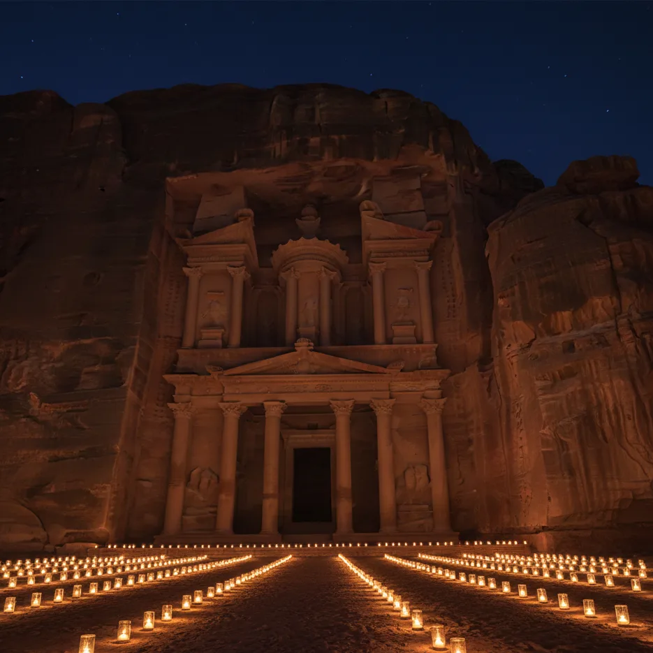 A la nuit tombée, Petra se transforme : les parois se taisent, le vent descend des plateaux, et le chemin du Siq s’illumine de centaines de lanternes de sable. L’expérience est aussi intime que spectaculaire ; elle joue sur l’acoustique, le rythme, la lenteur. Le Trésor apparaît alors dans une lumière douce, presque irréelle, qui révèle la texture du grès et l’échelle monumentale du lieu.