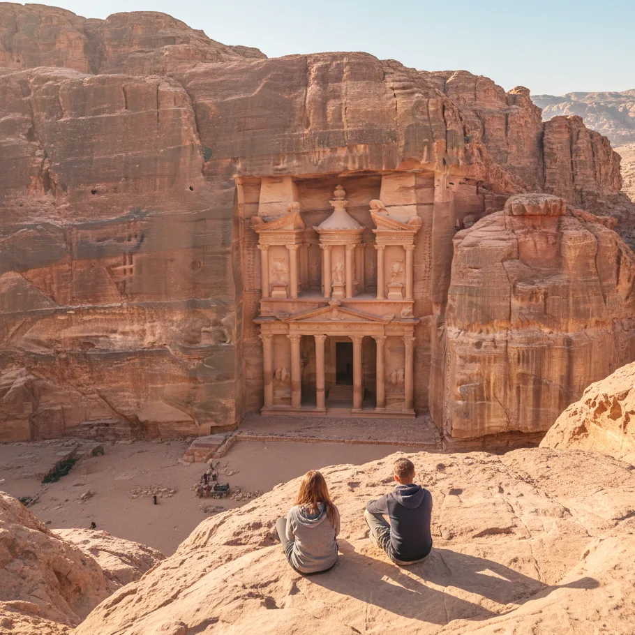 Depuis les hauteurs accessibles par sentier, le Trésor se lit autrement : proportions, alignement avec le Siq, circulation des visiteurs. Ces points de vue en balcon permettent aussi de saisir l’inscription du monument dans le relief plutôt que de le voir isolé.