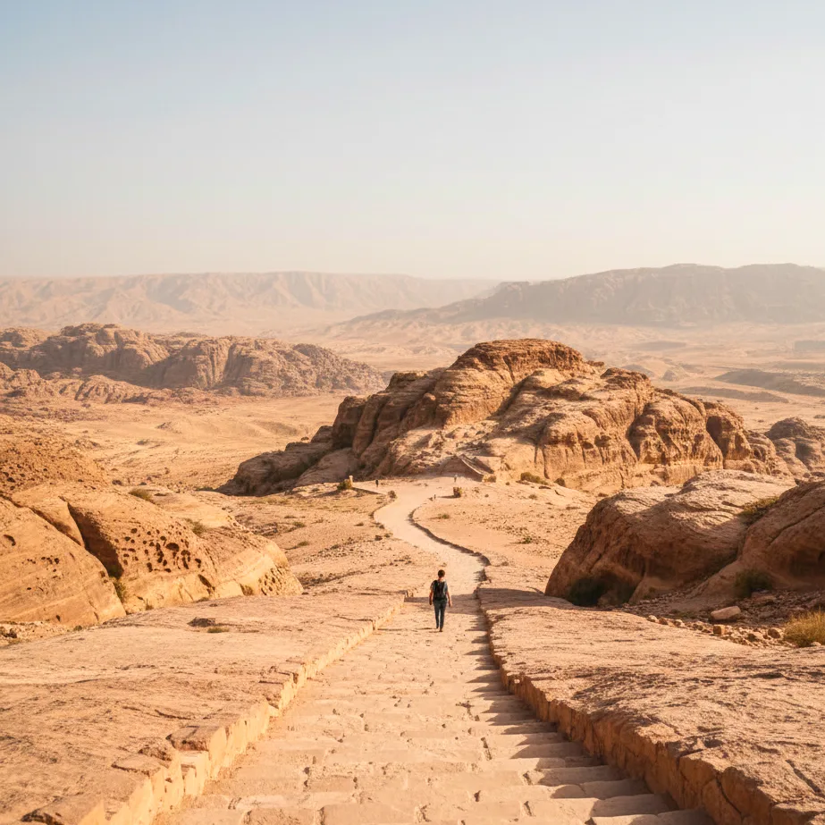 La montée vers le Monastère (le Deir) construit un autre rapport à Petra : plus physique et plus silencieux. On quitte les parois serrées pour un dédale d’escaliers antiques, de plateaux sableux et de roches aux stries épaisses. En chemin, quelques échoppes proposent thé ou bracelets en perles ; c’est une ascension rythmée, qui réclame de bonnes chaussures et un peu de patience. Au sommet, le paysage bascule : Petra s’élargit en un horizon de crêtes, de vallées et de vent.