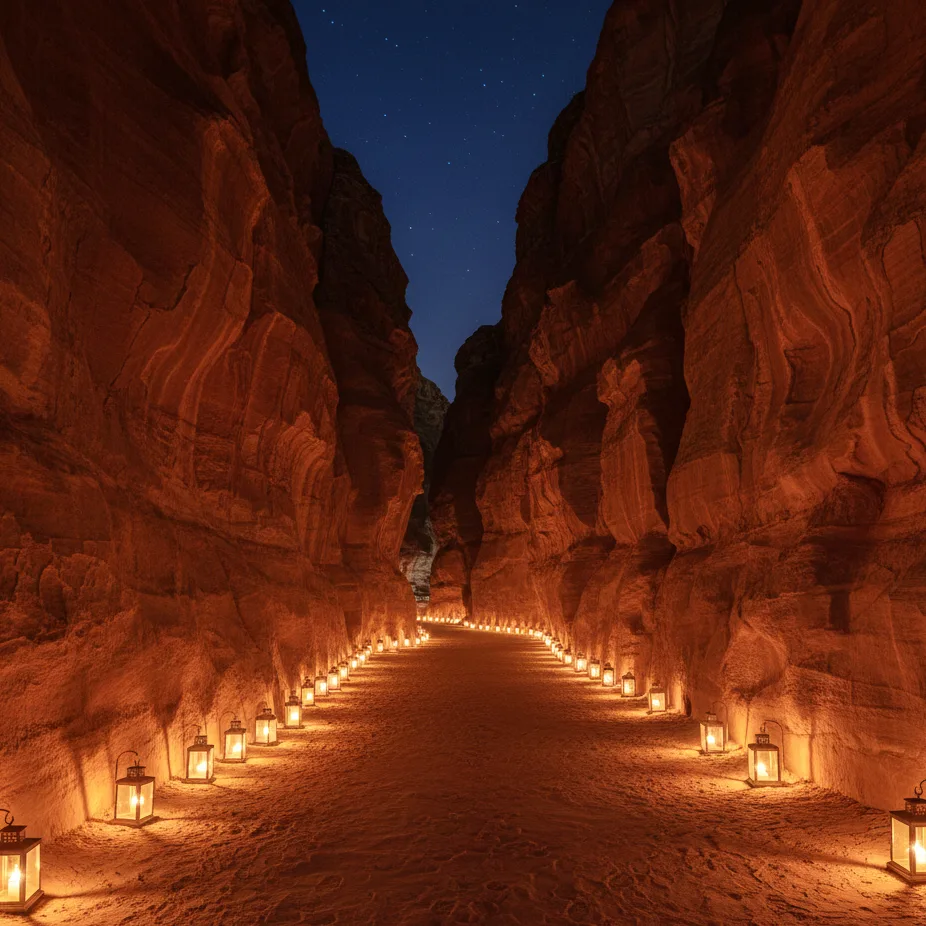 Les lanternes jalonnent le sol du Siq et transforment le canyon en couloir scintillant. La progression se fait lentement, au rythme des lueurs qui soulignent les parois et instaurent une atmosphère presque rituelle.