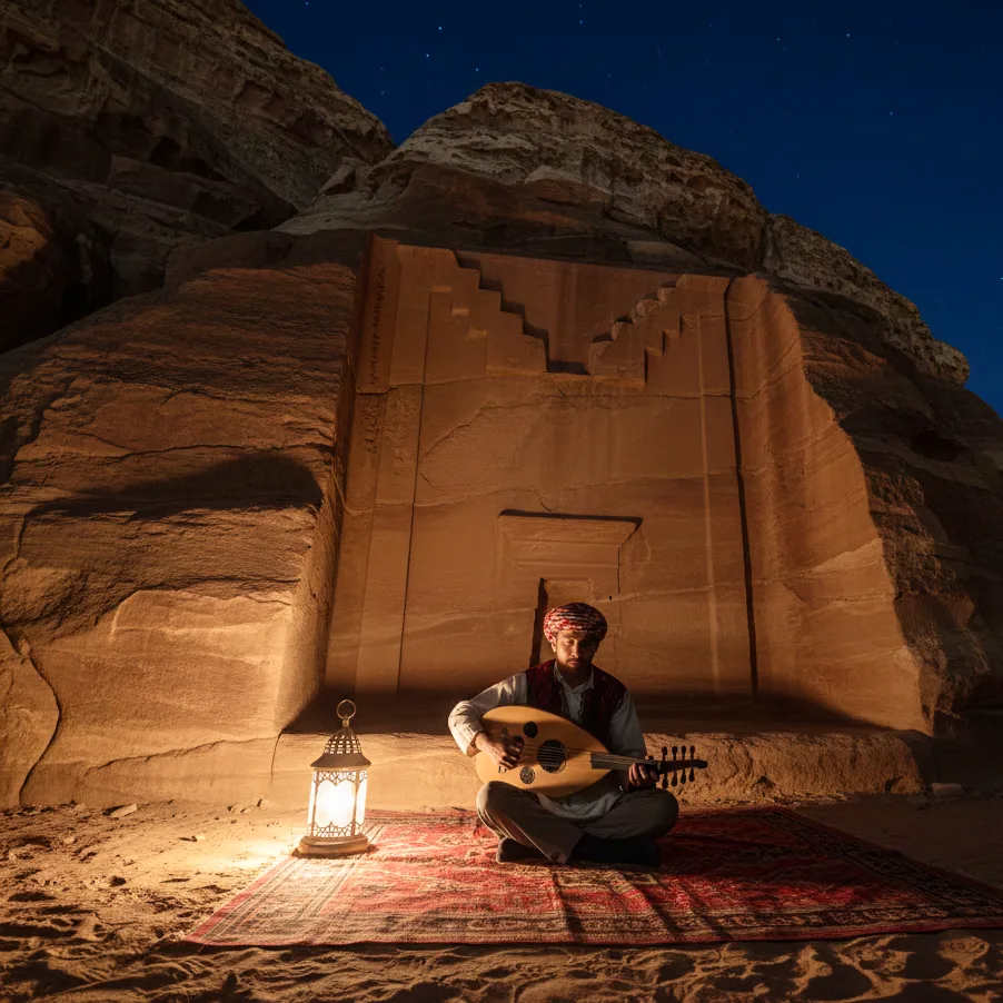 Assis près des lanternes, un musicien bédouin joue quelques notes d’oud ou de rababa. Les sons glissent sur la pierre, se percutent doucement et créent une acoustique ample, propre aux nuits de Petra.