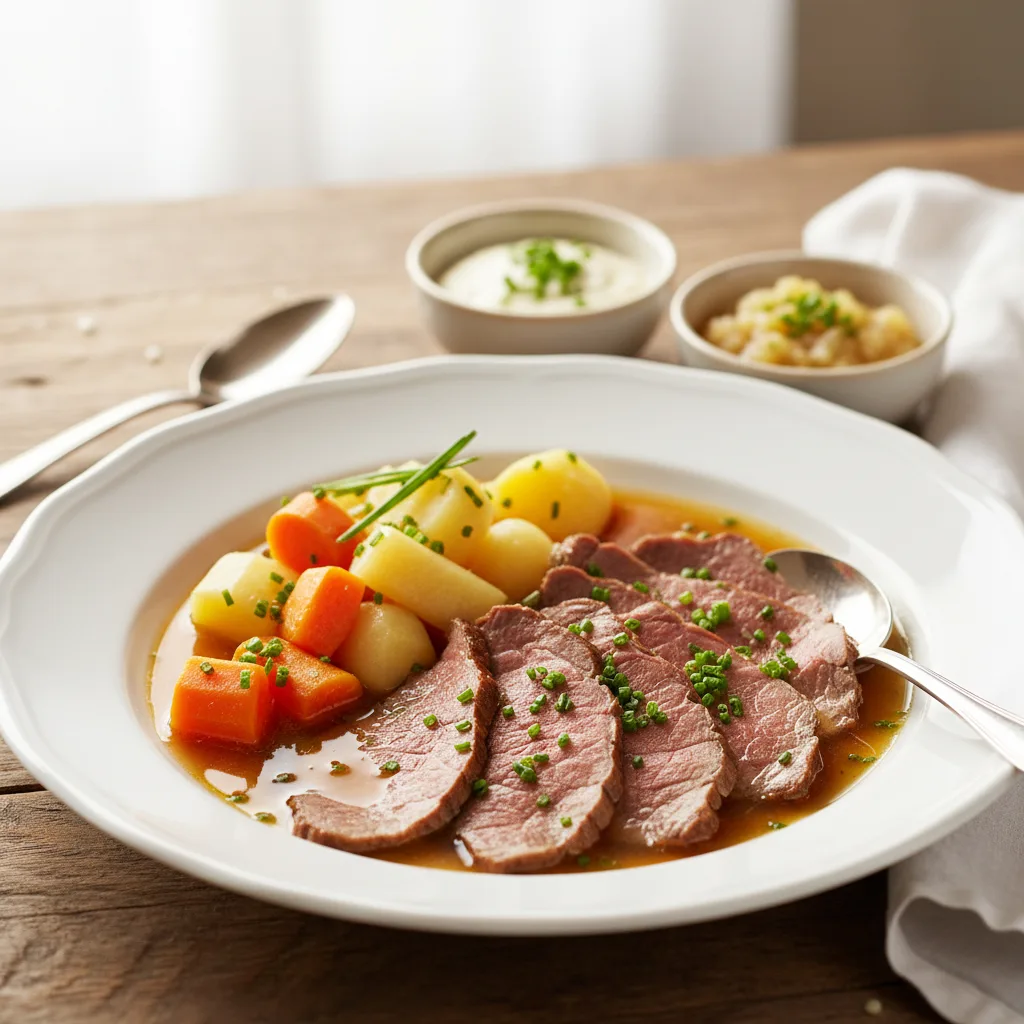 Tafelspitz Précision et respect du produit. Plat favori de l’empereur François-Joseph, le Tafelspitz est un bœuf bouilli servi avec bouillon, légumes et sauces traditionnelles. On le choisit pour un déjeuner plus posé, souvent dans une auberge ou une brasserie traditionnelle.