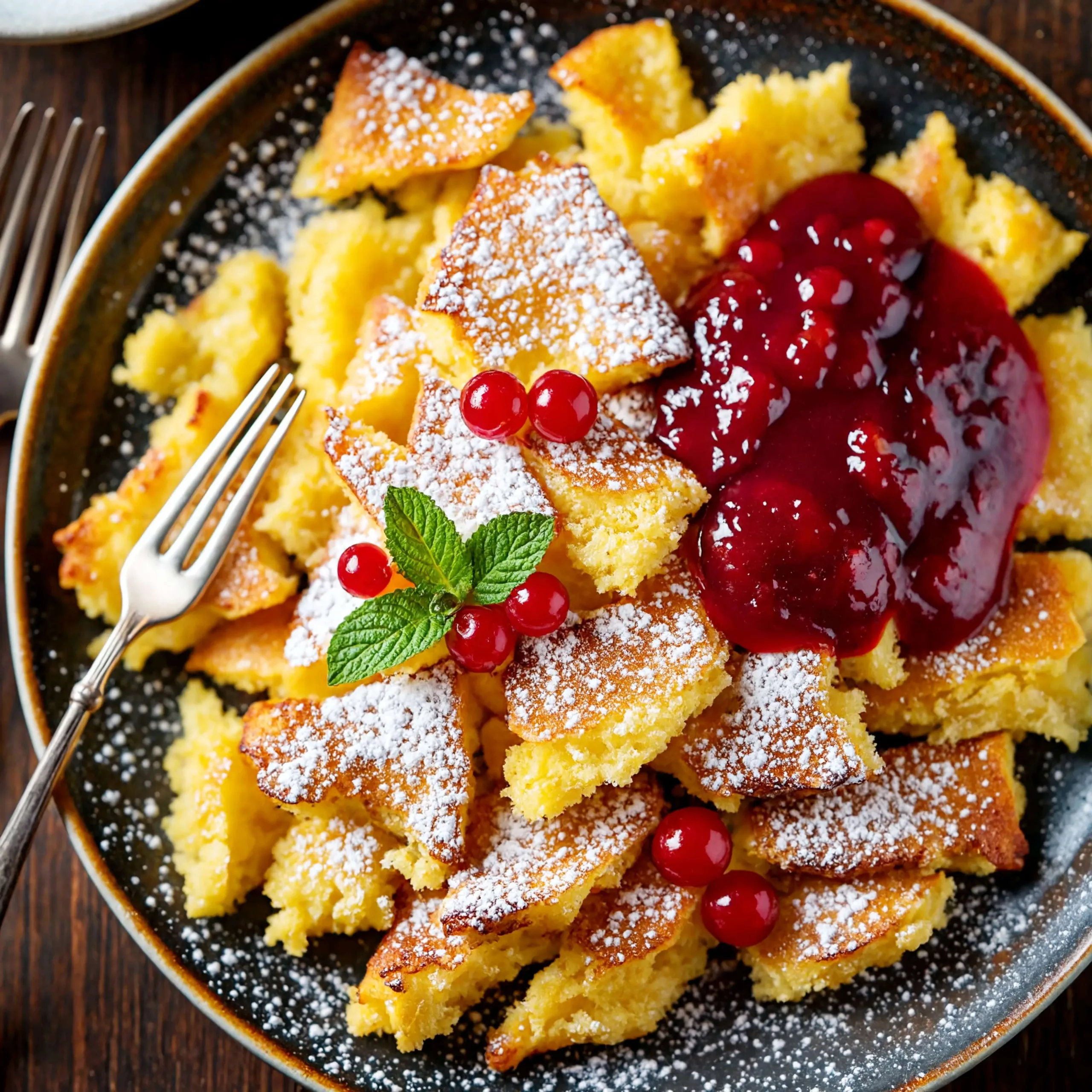 Kaiserschmarrn A mi-chemin entre dessert et plat de partage, le Kaiserschmarrn est une crêpe épaisse émiettée, dorée à la poêle et saupoudrée de sucre glace. Servie avec confiture ou fruits, une spécialité chaleureuse, idéale après une journée de marche ou en fin d’après-midi.